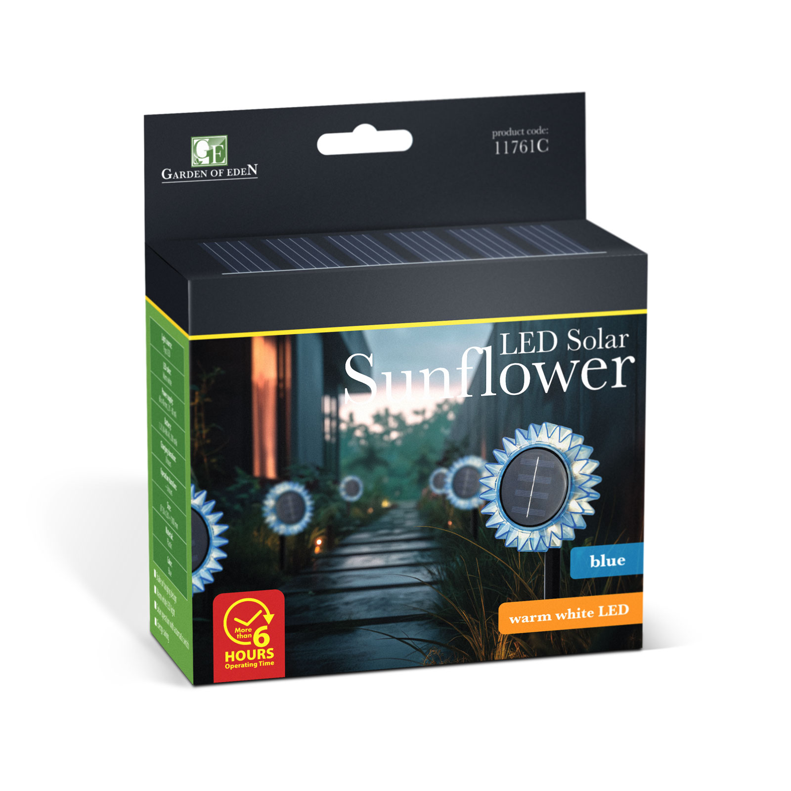 Ez a dekoratív szolár napraforgó lámpa hangulatossá varázsolja kertjét vagy teraszát. A többféleképpen rögzíthető kialakításnak köszönhetően leszúrhatóként és felakasztva is használható, így könnyedén illeszkedik bármilyen kültéri környezetbe. A beépített napelem napközben hatékonyan gyűjti a napfényt, melyből energiát biztosít az esti melegfehér LED világításhoz. A lámpa automatikusan kapcsol be sötétedés után, így nemcsak szép, de praktikus megoldás is a kert díszítésére.