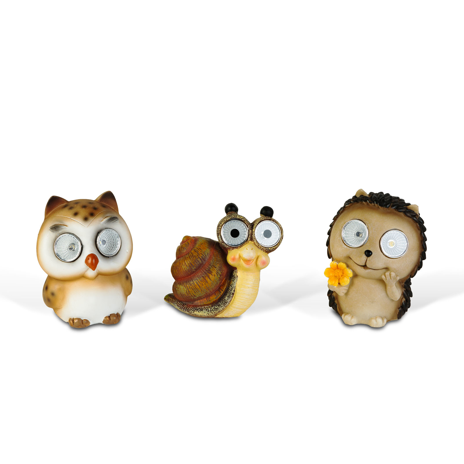 Tegye vidámabbá kertjét vagy erkélyét ezekkel a szolár állatfigurákkal, amelyek különböző formában érhetők el: csiga, süni, bagoly. A melegfehér LED-ek kellemes, hangulatos fényt biztosítanak, így nappal díszként, este pedig dekoratív világítóelemként szolgálnak. A beépített napelem napközben tölti az akkumulátort, így a lámpa sötétedés után automatikusan bekapcsol. A kis figurák kiválóan elhelyezhetők virágágyások szélén, kerti utakon vagy akár erkélyeken és ablakpárkányon is. Műgyantából, műanyagból készültek, így esztétikusak és időjárásállóak is egyben.